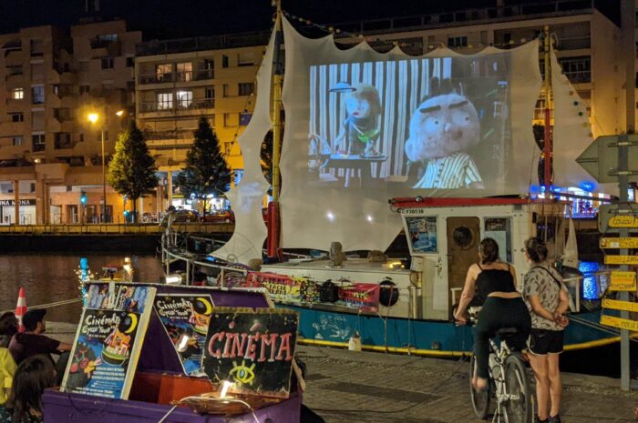 À la tombée de la nuit, l’équipage hisse la grande voile. Un écran unique apparaît pour offrir des séances de CinémâTs en plein eau.